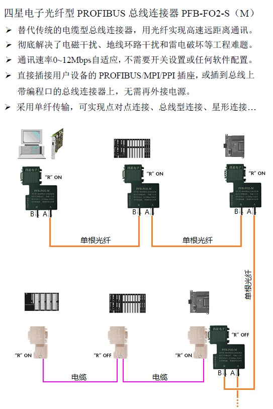 四星電子光纖型PROFIBUS總線連接器使用非常簡(jiǎn)單和靈活多樣,無(wú)需任何設(shè)置,即插即用??蓪?shí)現(xiàn)光纖的點(diǎn)到點(diǎn)連接、總線型連接、星形連接、以及混合型網(wǎng)絡(luò)拓?fù)浣Y(jié)構(gòu)。