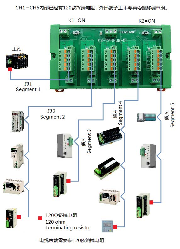 這種方案可以多出一個CAN口。擴(kuò)展總線CANH0、CANL0通常就近接主站設(shè)備,這個主站設(shè)備的CAN口需接一只120歐終端電阻,最后一臺FS-CANHUB-5右邊的開關(guān)撥到ON,除此之外的所有開關(guān)撥到OFF。如下圖所示,注意圖中開關(guān)的設(shè)置。